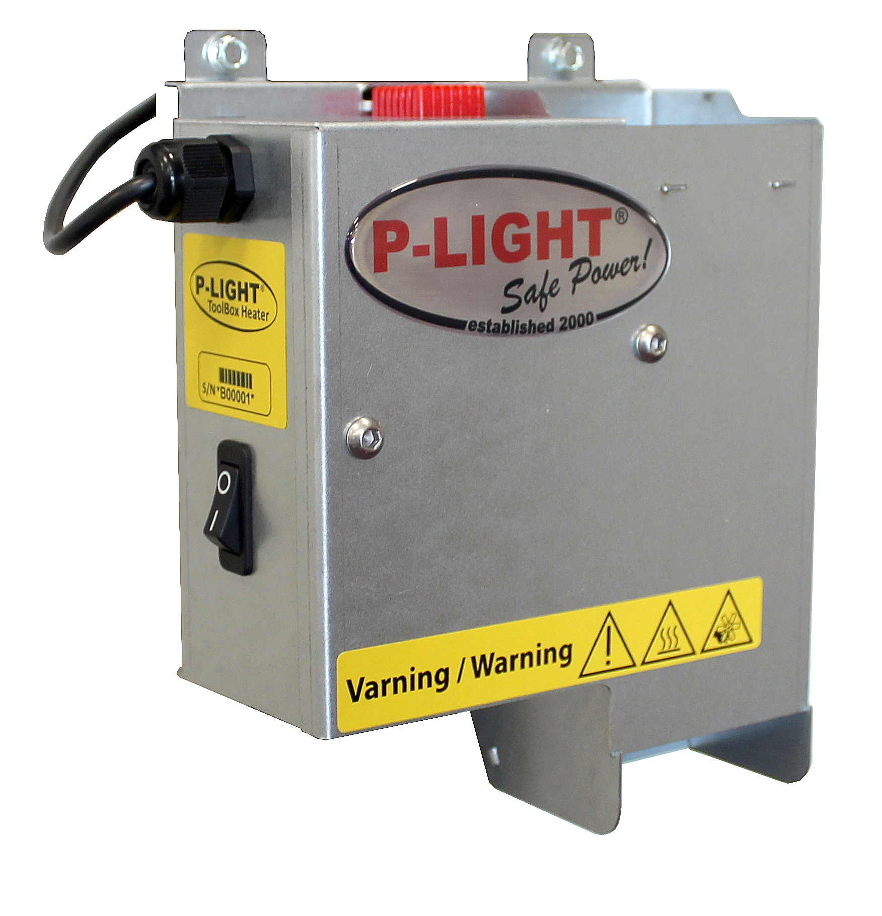 Lådvärmaren håller allt som förvaras i lådan i funktionsdugligt skick för användning, oavsett väderlek. Den här funktionen sparar såväl irriterande arbete som slitage på materialet, orsakat av tidsödande upptining i situationer där snabba insatser kan vara av stor betydelse ute på vägen. P-LIGHT ToolBox Heater skåpvärmare kopplas till lastbilens elsystem, alternativt ihop med P-LIGHT Batteri och Kraftpaket på släp och trailers.